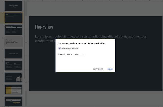 ทาง google ได้เปิดฟังก์ชั่นใหม่ในการตรวจสอบการเข้าถึง Slide ในกรณีที่แชร์ไฟล์ให้กับผู้อื่นที่ไม่ได้อยู่ในองค์กรเดียวกัน ซึ่งฟังก์ชั่นนี้ถือว่าเป็นการป้องกันในเรื่องการตรวจสอบการเข้าถึง Slideเป็นอย่างดีเยี่ยม